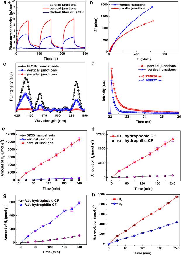 In view of this problem, Professor Liping Feng et al, from the Key Laboratory of Solidification, constructed a composite structure of ultra-thin two-dimensional BiOBr nanosheets and carbon fibers (CFs), and proposed a new idea to change the transmission path of photogenerated carriers and reduce the recombination of photogenerated carriers by changing the contact form between BiOBr nanosheets and CFs. In this scheme, by adjusting the preparation process of CVD, two-dimensional BiOBr nanosheets and CFs can present two completely different contact forms, namely, BiOBr nanosheets lying flat on CFs (BiOBr/C parallel junctions) or BiOBr nanosheets vertically inserted on CFs (BiOBr/C vertical junctions). The study shows that Schottky contact is formed between two-dimensional BiOBr nanosheets and CFs, and both parallel and vertical junctions have appropriate conduction band positions, which meets the thermodynamic requirements of photocatalytic decomposition of water for hydrogen production. Particularly, the parallel junctions have higher photocarrier yield and longer lifetime of electron-hole pair, and thus H2 production rate of the parallel junctions is up to 2850 μmol h-1g-1, which is 18 times that of the vertical junctions. Furthermore, the parallel junctions also show excellent characteristics of overall water splitting, and the H2 and O2 production rates are 240 μmol h-1g-1 and 110 μmol h-1g-1, respectively. In this work, the separation and transport characteristics of photogenerated carriers in two heterojunction systems are systematically analyzed. The whole process was demonstrated including photocarrier generated from two-dimensional BiOBr, separated and enriched to (001) crystal plane, and then transported to the active site of CFs by Schottky barrier. The influence mechanism of heterojunction morphology on carrier transport and catalytic performance is revealed, which provides a new solution to effectively reduce the recombination of photogenerated carriers in two-dimensional BiOBr.