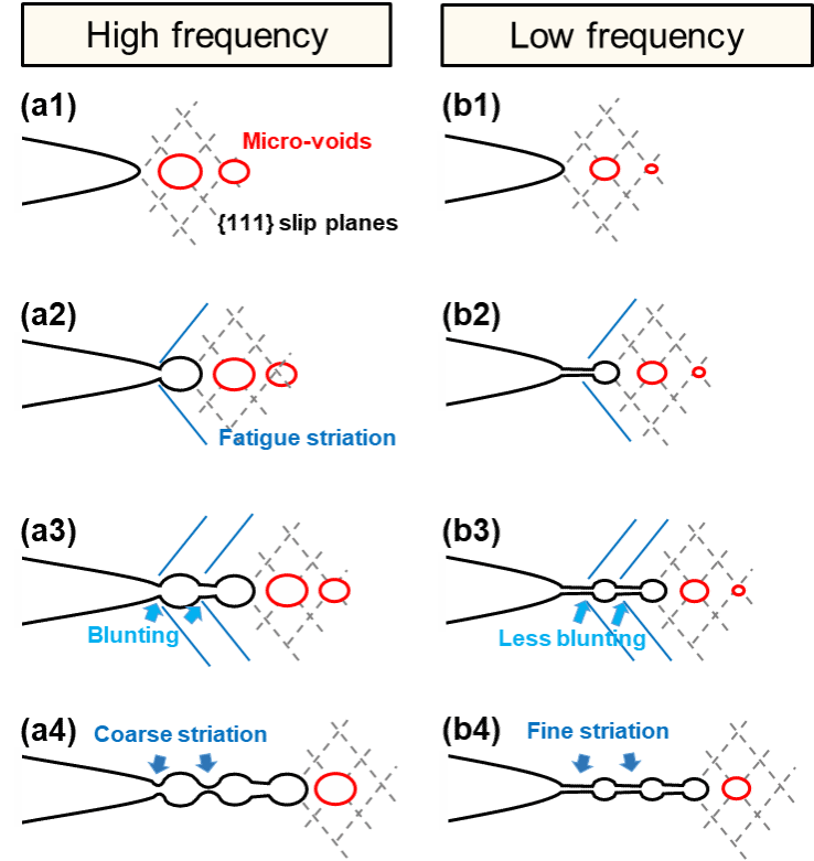 Professor Jinshan Li’s group from the State Key Laboratory of Solidification Technology conducted an in-depth study on the effect of hydrogen atoms on the fatigue crack growth behavior of IN625 alloy, elucidating the mechanisms of hydrogen-assisted crack propagation and fatigue striation formation. In this study, IN625 alloy underwent hydrogen charging at 600℃ under a hydrogen pressure of 1.15 kgf/cm2 for 20 hours, followed by fatigue crack growth experiments under constant ΔP and constant ΔK conditions with varying fatigue loading frequencies. The fatigue crack growth rates were calculated using the compliance method, revealing the influence of hydrogen on the crack growth rate.