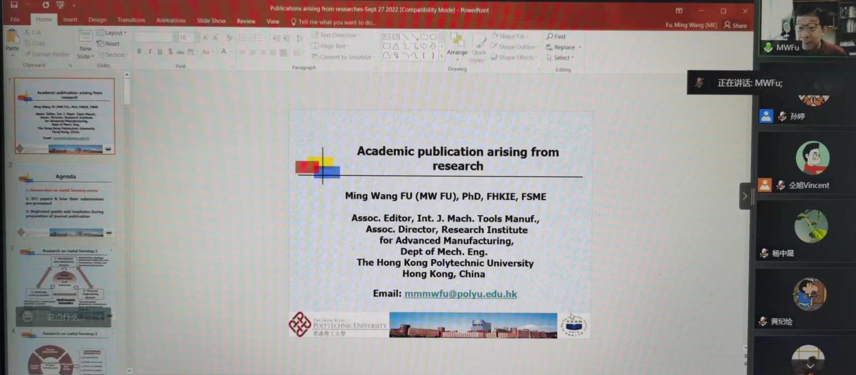9月27日早上10:30,第二期“材”领“慧”聚国际讲坛在公字楼328会议室举办。本期讲坛特邀香港理工大学傅铭旺教授开展题为How to Prepare the Academic Publications Arising from Research的报告。