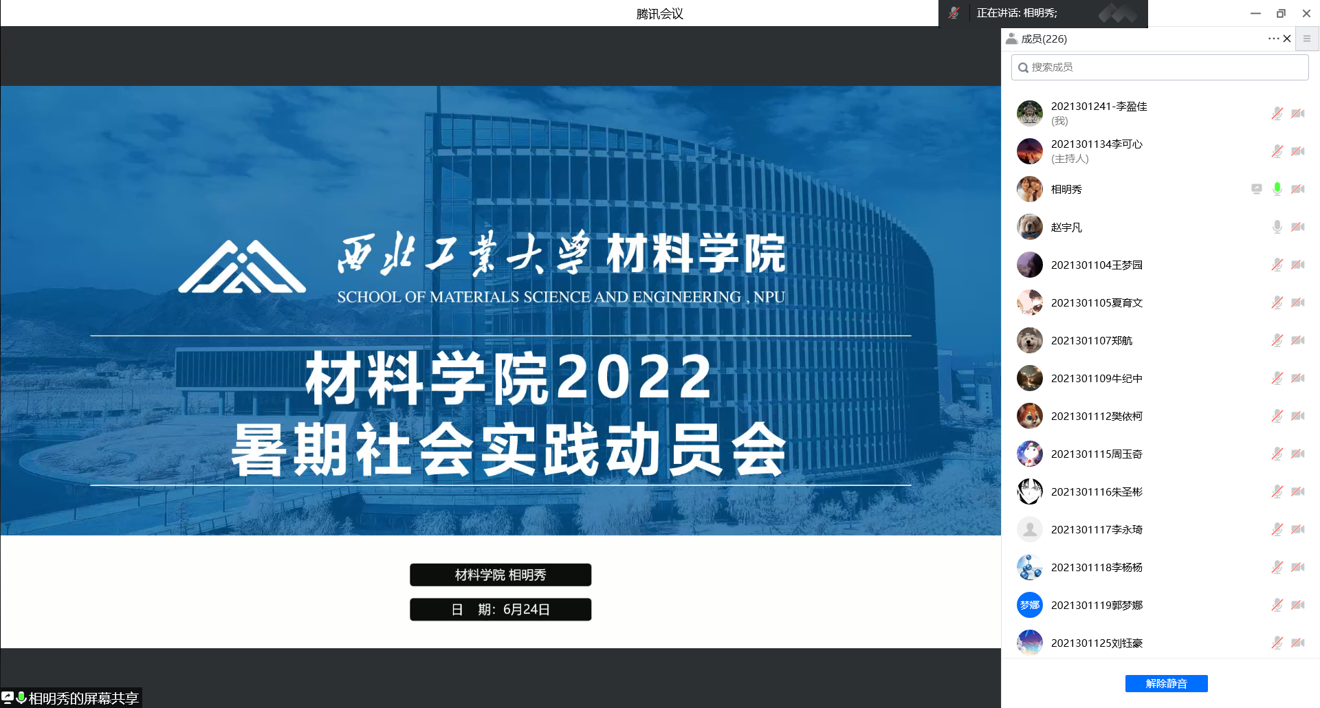 2021级以线上方式召开暑期社会实践动员会,相明秀同学将社会实践的可参与项目、相关注意事项等讲解给学生,并回答学生的相关疑问。
