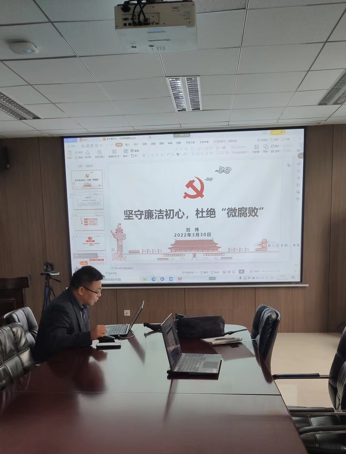 刘伟以微腐败为主题,为毕业生们讲授廉洁党课,引导同学们要要树立正确的世界观、人生观和价值观,加强自身廉洁教育,绝不能放任自己、放纵自己。