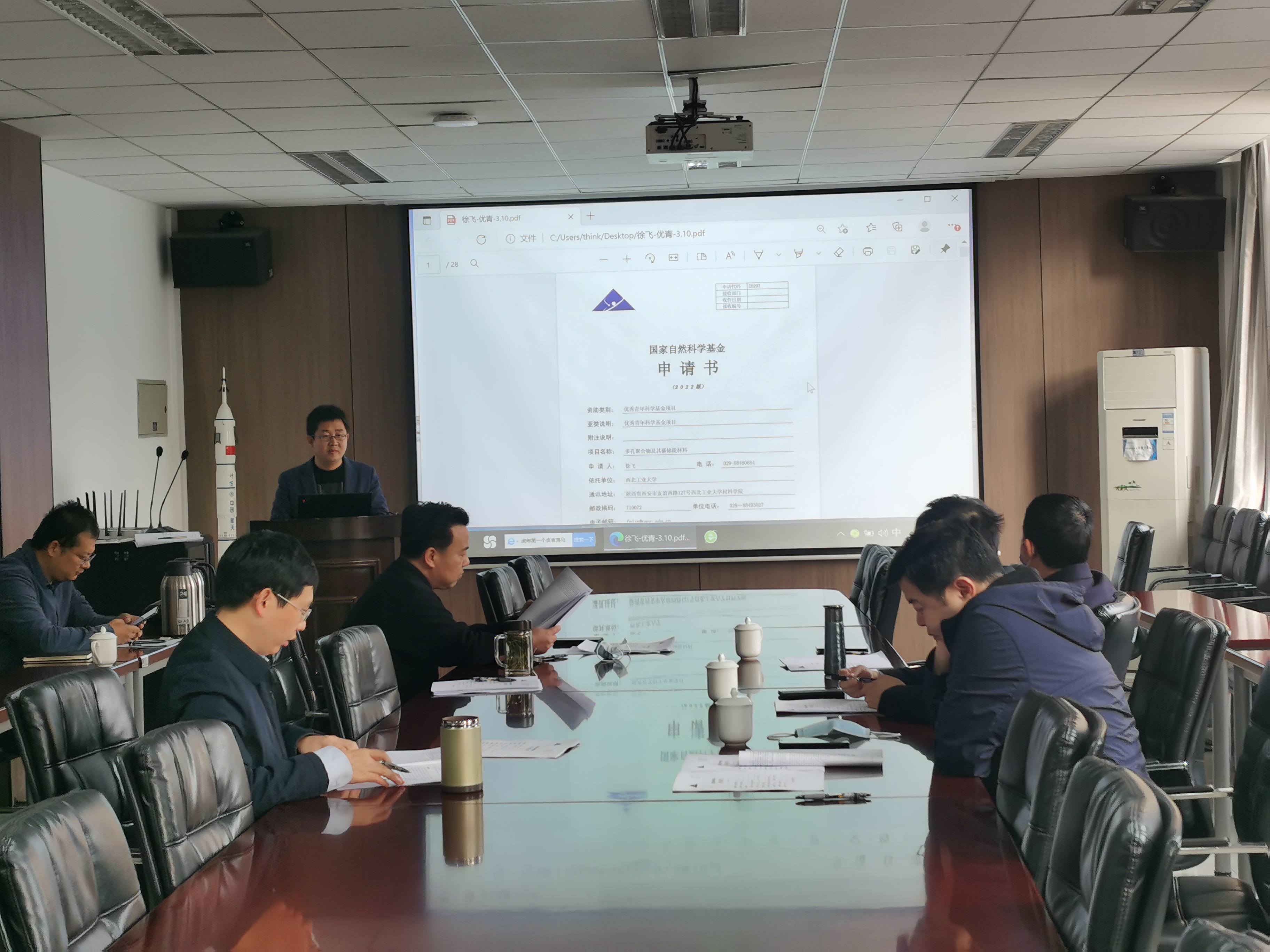 在公字楼322会议室开展国家自然科学基金杰青和优青申请项目预评审会。学院邀请成来飞、付前刚等四位教授对本年度拟申请的杰青和优青的项目进行评审。会议由副院长苏海军主持。
