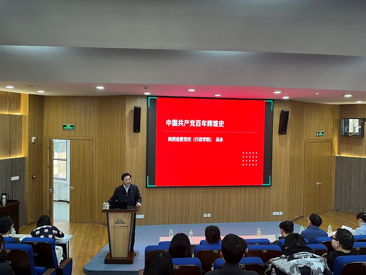 党委邀请陕西省委党校副校长吴永教授讲述“中国共产党百年辉煌史”专题党课。党课学习由党委副书记罗皎主持,学院党委理论中心组成员,各师生党支部书记、副书记现场参加了本次党课学习,其余全体党员在线上聆听了本次党课。