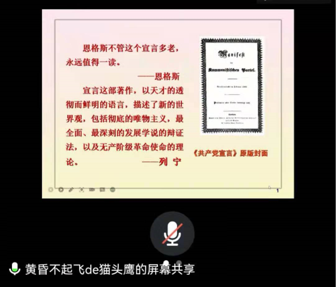在社会实践的最后实践队举行了线上会议,会议内容包括经典党史书籍《共产党宣言》的阅读学习与交流分享两个环节。队员们深入探索伟大革命背后的底蕴,了解体会《共产党宣言》这一中国伟大革命的圣火,体悟革命先辈们的思想。每位队员都发表了自己阅读后的感悟并总结了五天来的收获与成长,“寻母城记忆 传红色历史”实践队“返家乡”党史实践活动就此圆满结束。
