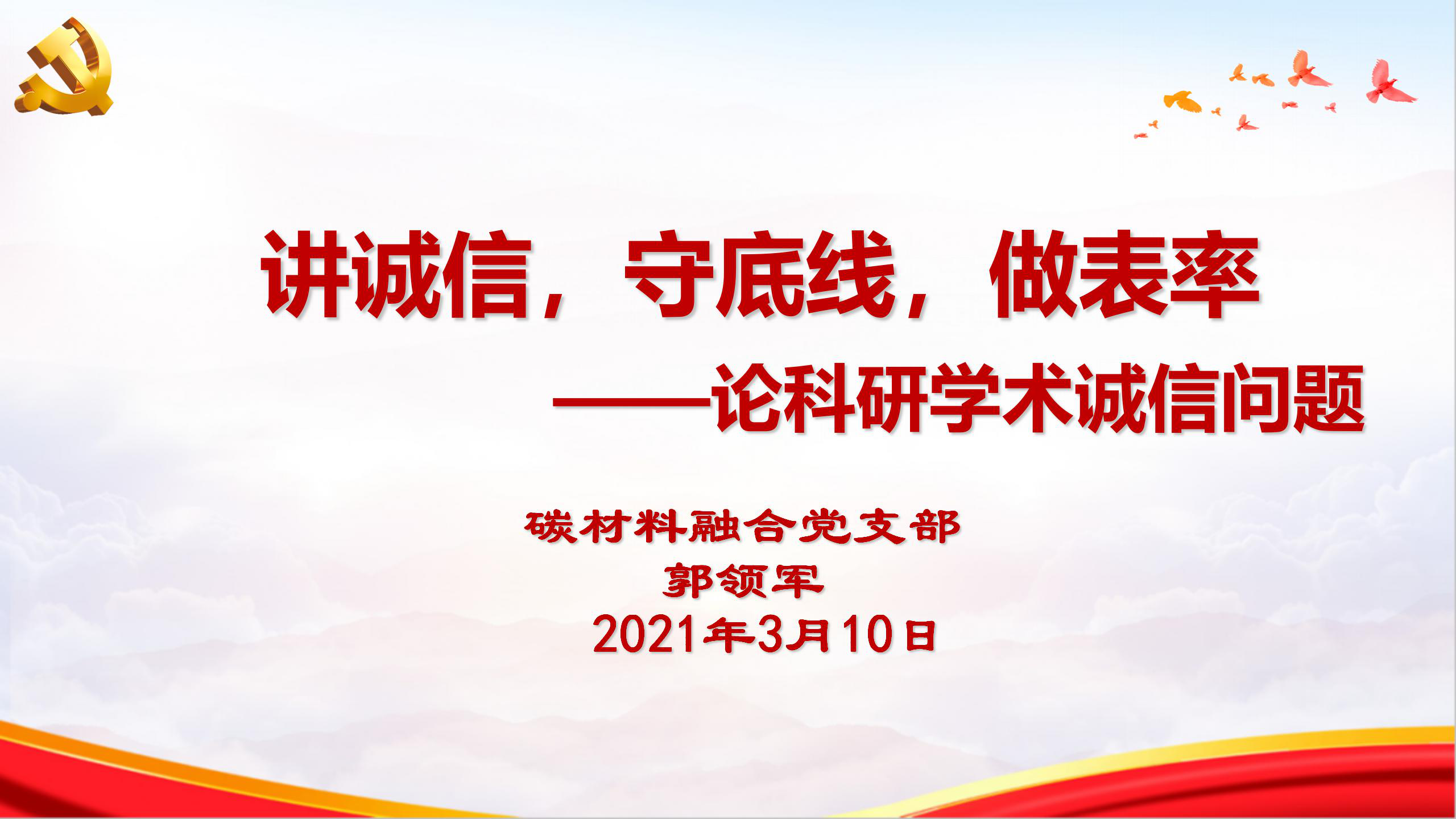 碳材料融合党支部于2021年3月11日晚在研究生西馆XB101召开“讲诚信,守底线,做表率”专题党课,会议由支部书记郭领军主持。