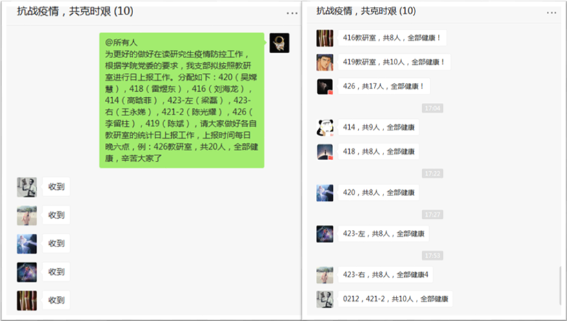 为严格落实肺炎疫情防控日报制度,郑泽邦同志还强调作为党员要积极发挥先锋模范作用,博士生要每日通过翱翔门户按时上报当日个人情况,教工要积极配合学院工会小组做好信息统计工作。另外,为做好研究生疫情防控工作,党支部还创新工作模式,除每日按时上报外,以所在教研室为单位做好课题组人员身体状况统计,并再次强调按照学校规定时间返校,在家期间尽量减少外出次数,积极做好日常清洁、消毒及防护工作。