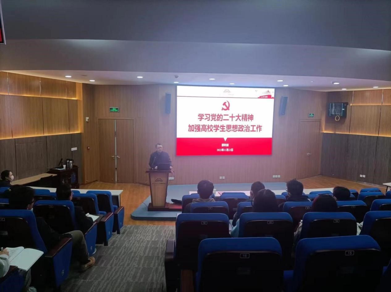 会上,蔡利剑做了题为“学习党的二十大精神,加强高校学生思想政治工作”的专题报告,围绕深入学习领会党的二十大精神核心要义、深入把握党的二十大报告的大政方针和总体部署等方面,进行了系统的讲解和阐述。并表示当代青年应当胸怀祖国、勇攀高峰、发扬敢为人先的创新精神,抓紧学习,搞好科研,做好自己的事情,努力实现党的二十大赋予青年一代的历史使命。
