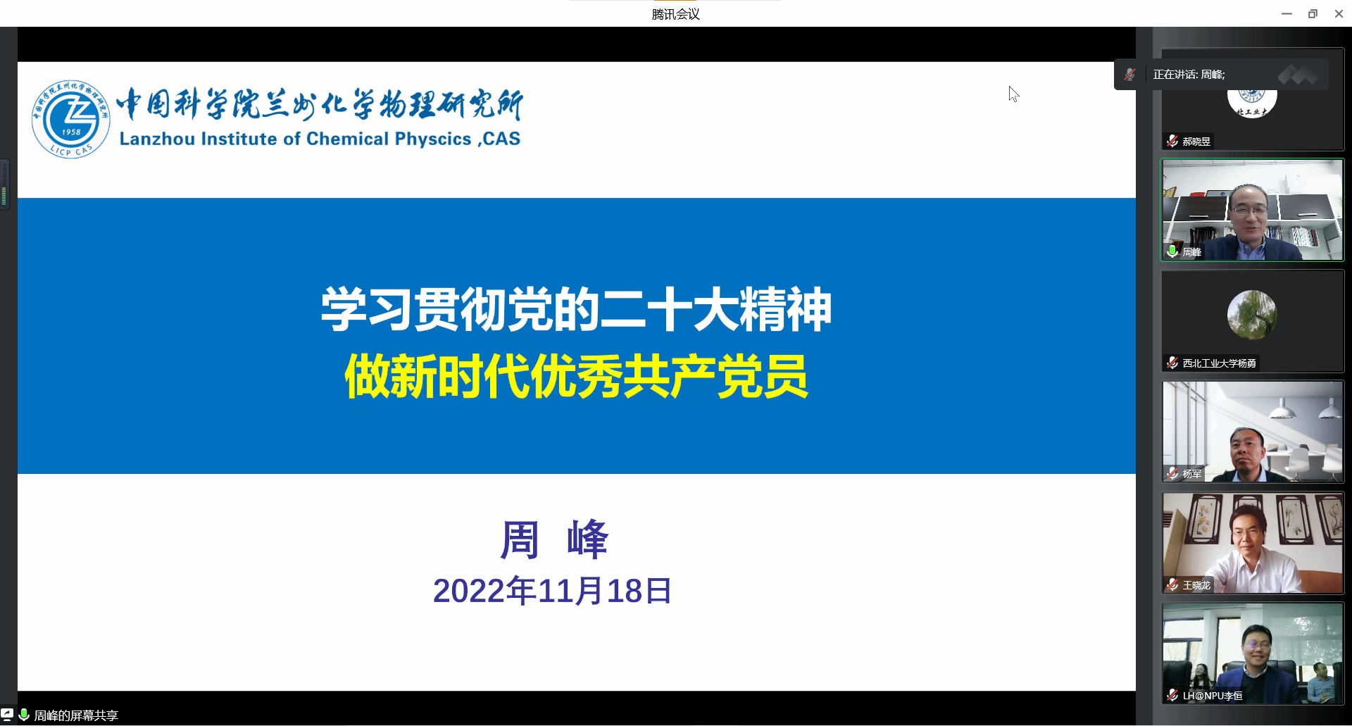首先,中科院兰州化学物理研究所所长周峰作了题为《学习贯彻党的二十大精神——做新时代优秀共产党员》的专题报告,从当前国际形势,教育科技创新和人才培养等方面,对党的二十大精神进行了宣讲和阐释。周峰强调学习领会党的二十大对科技创新工作的指示精神,加快创新驱动发展,为全面建设社会主义现代化国家贡献力量。