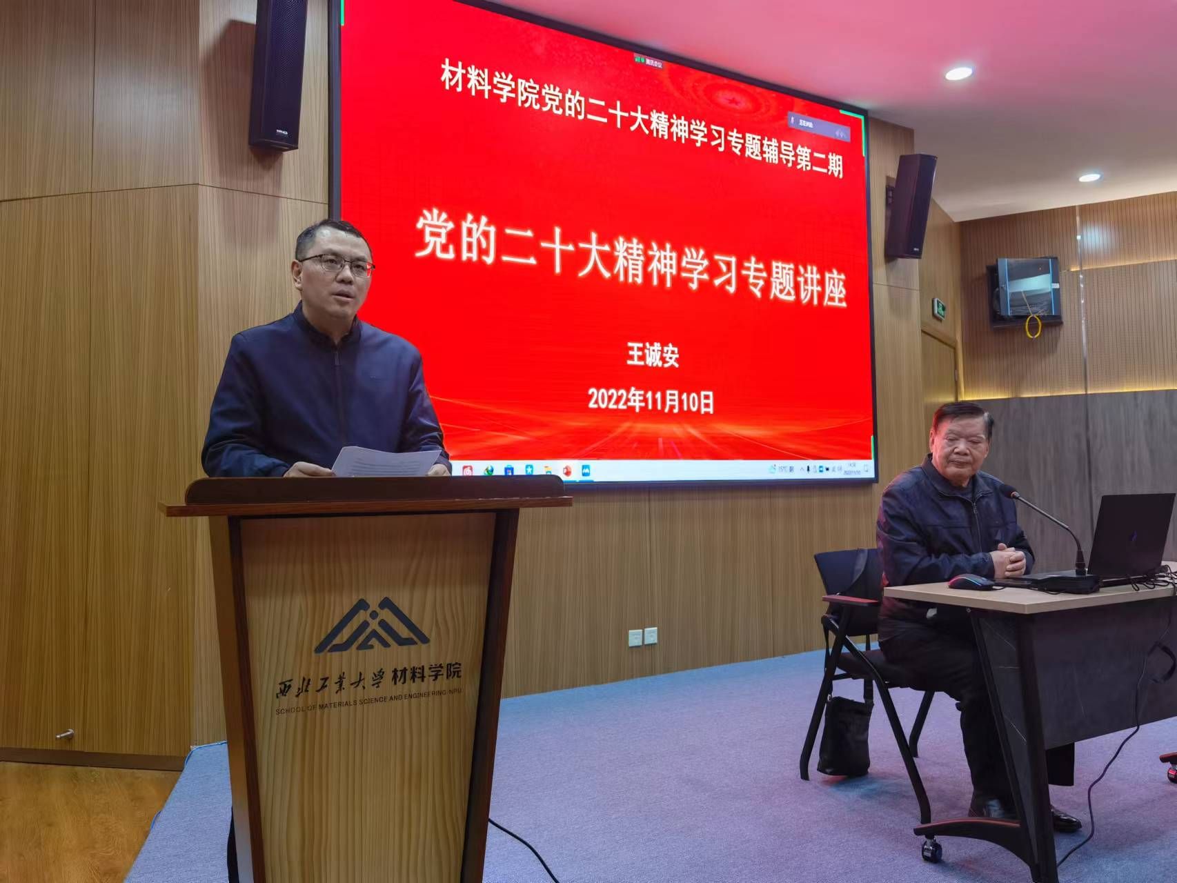 11月10日下午,做爱色情片 举办“大材良治”——党的二十大精神学习专题辅导讲座第二期,本次活动由锻压第一、第二研究生党支部承办。学院邀请省委党校王诚安教授讲授“党的二十大精神学习解读”,学院党委理论学习中心组成员、机关党支部党员、锻压第一和第二研究生党支部党员聆听了本次讲座。做爱色情片 党委副书记蔡利剑主持,党委副书记(主持工作)李恒介绍了王诚安教授学术简介。