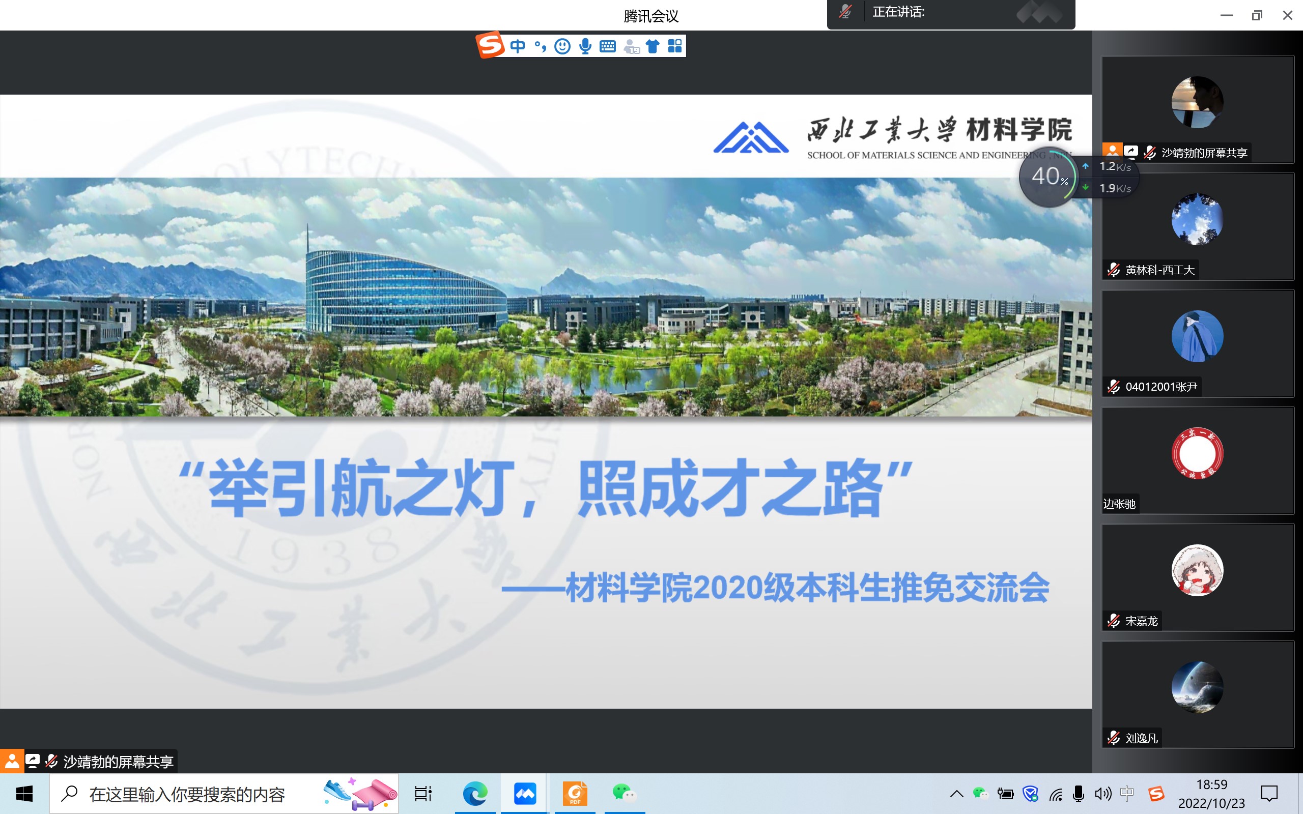为推进学院学业学风建设和帮助2020级本科生更好地了解学校研究生推免相关政策和要求。在学院蔡利剑副书记和2019级辅导员的大力支持下,10月23日晚7点,2020级本科年级邀请到边张驰、吴昊泽、黄诚俊、秦文洋和张路通等五位2019级同学线上分享了学习、竞赛和科研等经验,2020级120多名本科生和2020级辅导员线上参会。