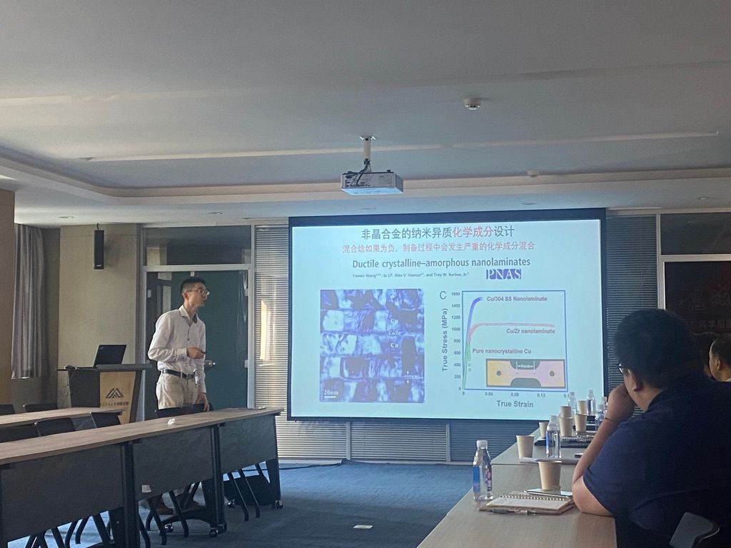 材创“0-1”青年学术论坛邀请西安交通大学吴戈教授做了题为“多级纳米化学异质非晶合金实现室温大塑性均匀流变”的学术报告。报告由王龙教授主持,学院青年教师和学生30余人参加会议。