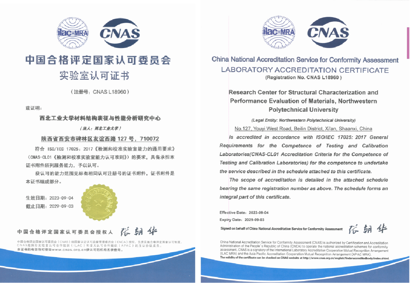 材料结构表征与性能分析研究中心(陕西省材料分析研究中心)正式通过中国合格评定国家认可委员会(CNAS)审核,并取得实验室认可证书(注册号:CNAS