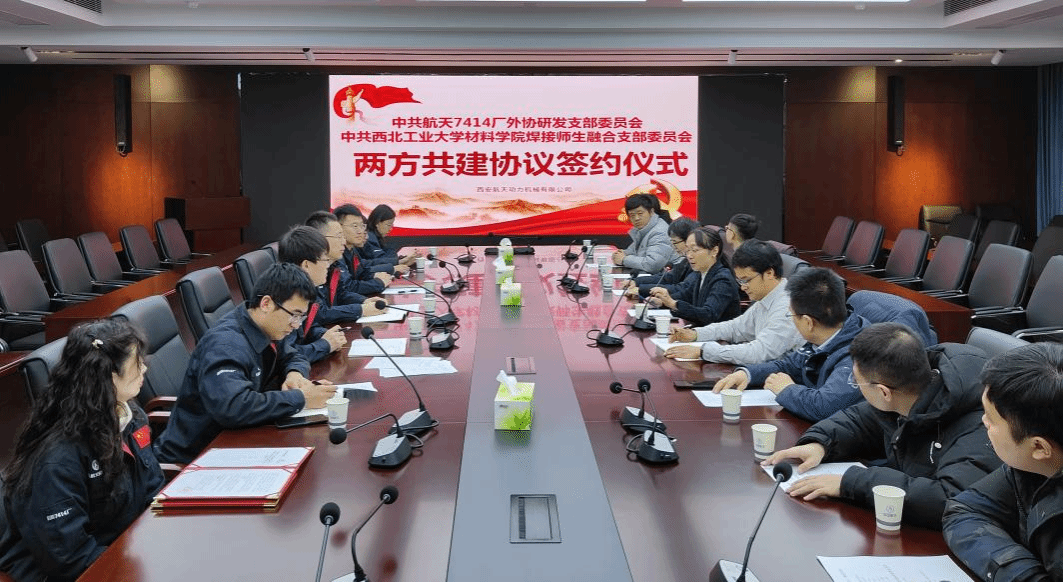 7414厂副厂长熊波,7414厂外协研发党支部书记王秉祥,7414厂研发中心副主任赵琳瑜,7414厂研发中心高工王猛、李忻婷、写旭,7414厂研发中心工程师张锋、吴帅等领导和专家,焊接师生融合党支部部分教授和学生代表出席并见证了共建活动。