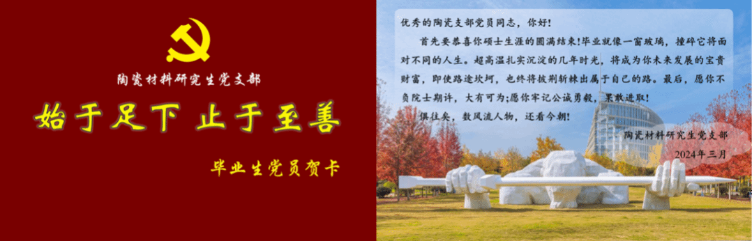 大会第三项,马雪寒同志代表党支部,亲手向毕业生送出了毕业贺卡,上面写着由张立同院士亲笔提下的“始于足下 止于至善”毕业寄语。这份简单又珍贵的毕业礼物激励着2024届毕业生们在工作和学习中不忘初心,继续前行。