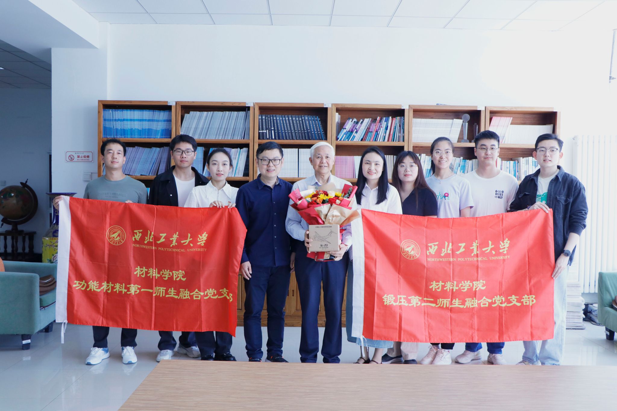 退休教职工周万城教授。凝固技术国家重点实验室副主任徐亚东,院办教师代表张曦,锻压第二师生融合党支部和功能材料第一师生融合党支部的7名学生代表参与了本次活动。