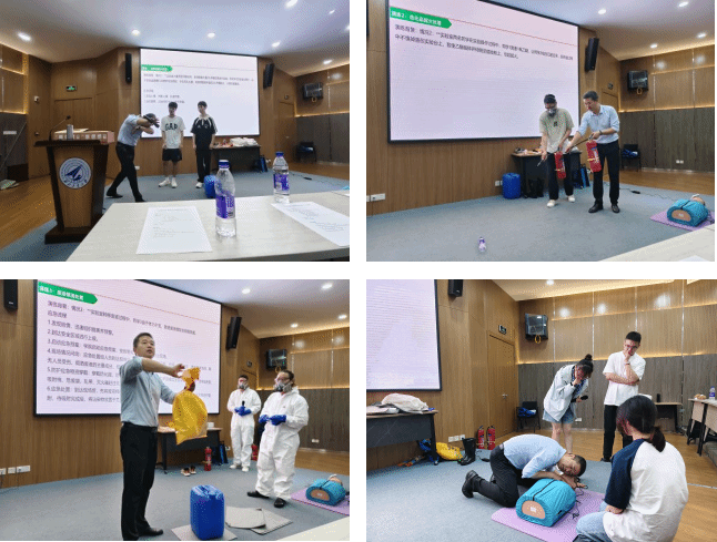 随后,举行了多场景综合演练。在“20L甲醇起火”“500ml乙醚起火”场景中,刘涛对火情处置全流程进行演示,并讲解了注意事项;在“有机废液桶倾倒泄漏环节”,演练人员规范穿戴防护装备,按“围堵、吸附、中和、清运”流程处置泄漏物;面对“实验人员误操作触电”事故,救援组快速切断电源,利用绝缘工具施救,并对“伤者”开展心肺复苏急救。各环节衔接紧密、处置科学,全面检验了应急预案的可行性与团队协作能力。