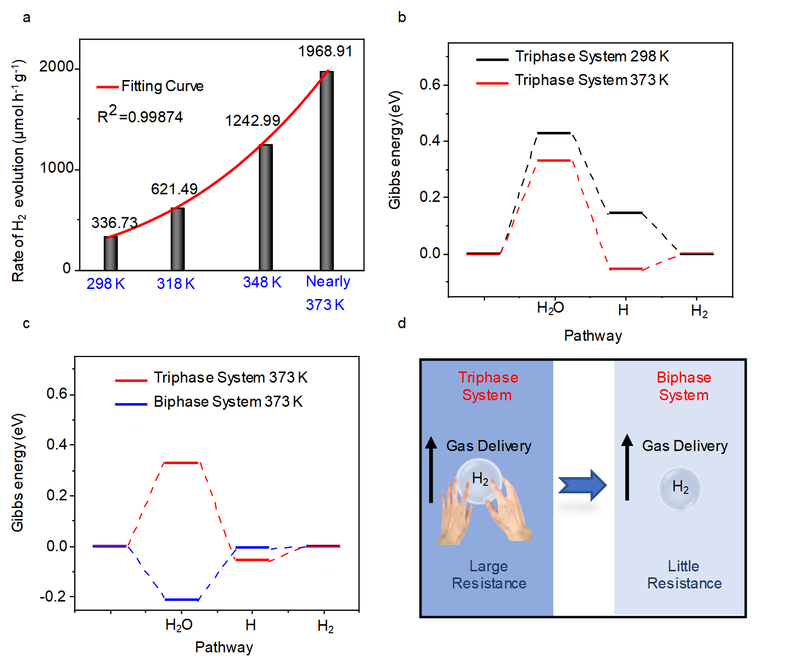 李炫华教授与合作单位提出一种两相反应界面的光催化系统,通过构筑光热基体和光催化材料复合体系,在光照下,光热基体将液态水转化为水蒸气,同时水蒸气在催化剂表面被光催化分解为氢气。该思路不同于传统的三相光催化反应体系(液态水/光催化剂固体/氢气),复合体系可实现“气相水蒸气/固相光催化剂/气相产物氢气”的两相反应界面,有效降低光催化反应势垒,并显著减小氢气的传输阻力。当催化剂材料为CuS-MoS2时,光催化产氢速率达到85604 μmol h-1g-1。该方法设计简单,产氢性能优异,表现出优异的普适性,为后续氢能的实际应用提供新的思路。