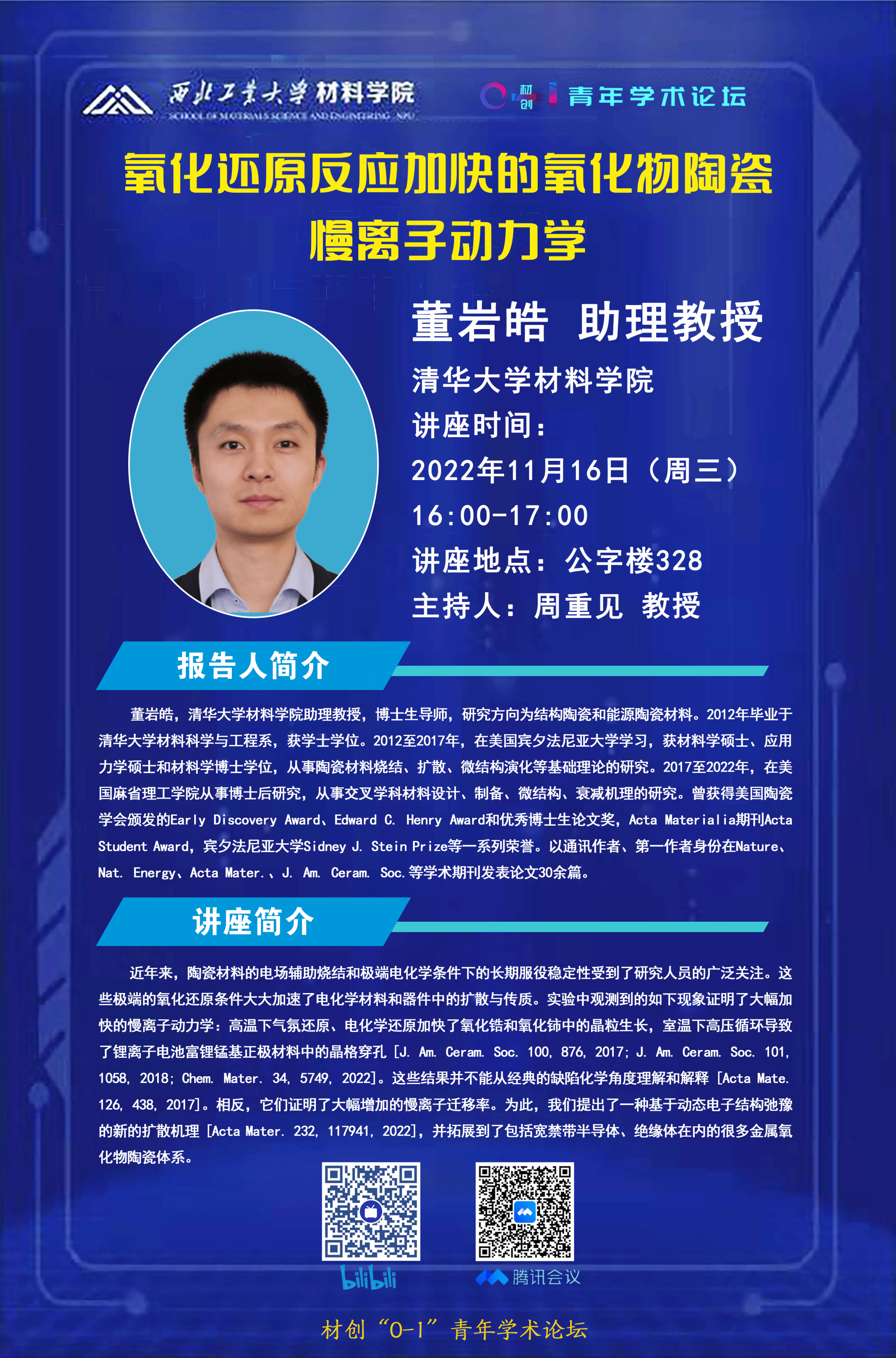 主题:氧化还原反应加快的氧化物陶瓷慢离子动力学主讲:董岩皓 助理教授时间:11月16日16:00地点:公字楼328会议室在B站和腾讯会议线上同步进行,欢迎各位老师参会交流!