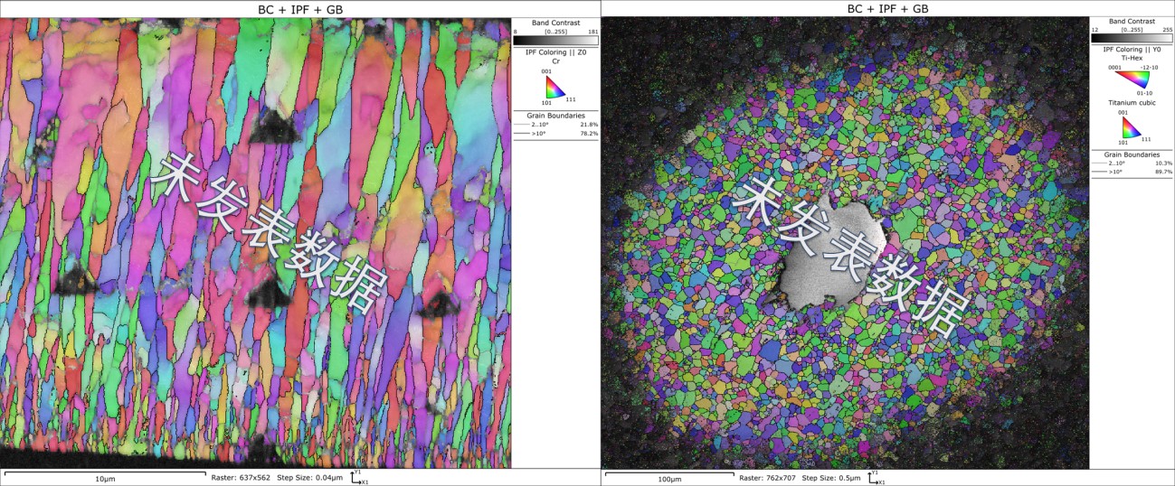 薄膜截面压痕EBSD扫描(左)钛合金透射样TKD分析(右)