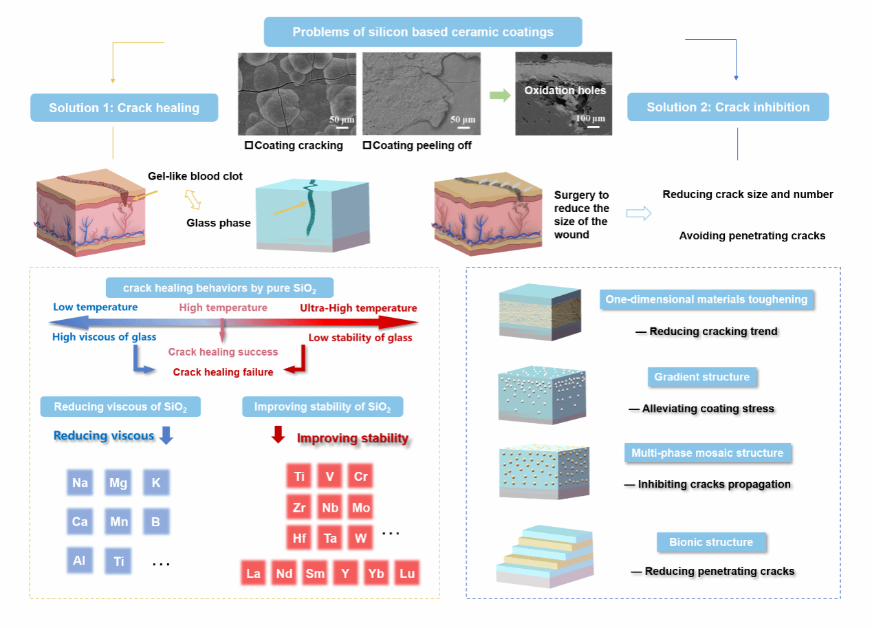 新一代航空航天飞行器的快速发展对热结构材料在高温氧化环境中的抗氧化性能提出了严苛要求。硅基陶瓷涂层技术是提升碳/碳(C/C)复合材料和陶瓷基复合材料(CMCs)等热结构材料抗氧化性能的有效方法。然而,服役过程中涂层常因与基体热膨胀系数不匹配而发生开裂现象,这削弱了涂层对基体的氧化防护效果,甚至导致涂层失效。基于皮肤伤口自愈合自修复机制,本文综述了解决涂层开裂问题的两个重要手段——裂纹愈合(涂层自愈合成分设计)和裂纹抑制(涂层增韧结构设计)。相关材料设计方法为新一代热结构材料用先进硅基陶瓷涂层研发提供了理论支撑。